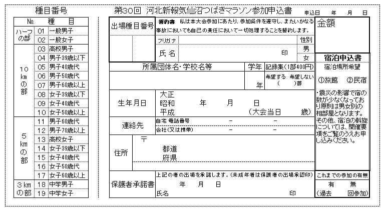 | ・未成年の方は必ず保護者承諾が必要です。 ・金額は参加料・記録集・宿泊予約金の合計金額を記入して下さい。 |