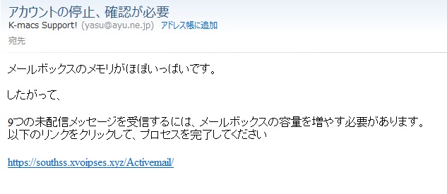 2021年1月29日、一部のお客様に下記のような内容のメールが届いたとの報告があります。 当社で、このようなメールをお客様に配信している事実はございません。 迷惑メールですので、本文中のURLはクリックせず、速やかにメールの削除をお願いいたします。 |